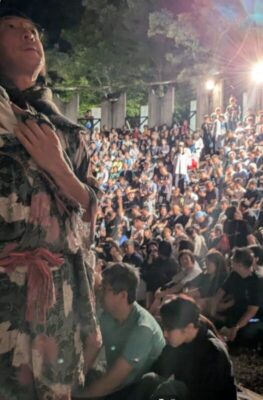 ・・・多分まったく理解できないのでゃないかと危惧しましたが、野外劇場の要所要所の打ち上げ花火の迫力や「ニッポンジン」と何度も問いかける主題、敗戦から現代の米国の「蒐集」システムに組み込まれた日本の在り方への問い、演劇中に盛り込まれる日本の歌謡曲「夜の訪問者 小川順子」「海ゆかば 伊藤久雄」「恋の十字路 歐陽菲菲」「船頭小唄 美空ひばり」等胸に迫るものがあり、考えさせられるものがありました。鈴木氏は「ニッポンジンとは何か?」との「問い」を発していると感じました。