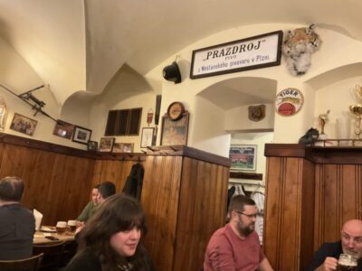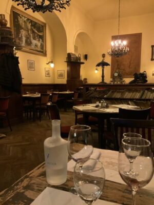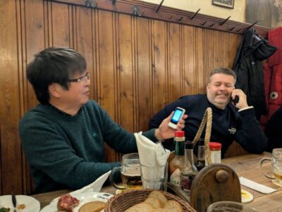 プラハでは「黄金の虎」という有名な古いお店に行きピルツナー🍺を飲みました。タルタルステーキが目的でした。相席だったために写真の方と乾杯🍻をして話し込みました。チェコ語でしたのでポケトークが大活躍でした。オーストリアのリンツの大きな機械工具会社のチェコのセールスマネージャーの方でした。ビジネスパートナーがプラハ城に来ているのでここで待っているとのことでした。写真は彼がビジネスパートナーに電話をかけているところです。待っている間にジョッキ5杯呑まれました。20歳の時に若気の至りで20杯呑まれたそうです。アルコール度3%位で何も食べずに呑まれます。チェコ人が世界で1番🍺を消費されるそうです。数字で説明して頂きました🫢奥様がスペインが好きで年3回行かれるそうです。美しい奥様の写真や子供さんの社員も見せて頂きました。