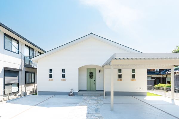 平屋ならではのデザイン。三角屋根とグリーンの玄関ドアが、お家の顔を可愛く彩ります。