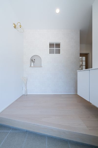 玄関のニッチと格子窓が、訪れる人をやさしくお出迎え。お家に帰るのが楽しみになる空間です。