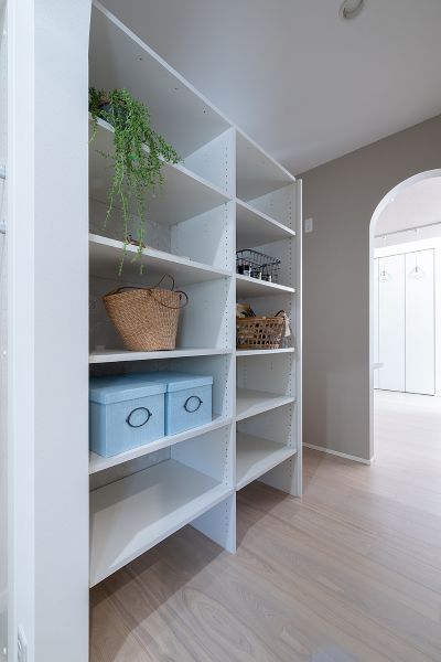 冷蔵庫も置ける大容量パントリー。たっぷり収納でき、生活感もすっきり隠せます。