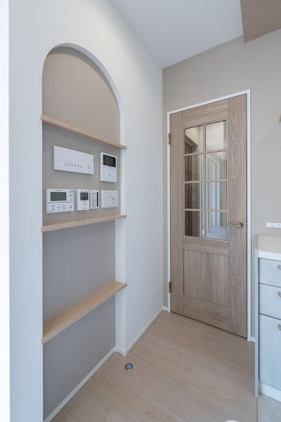 可愛い格子ドアが空間のアクセントに。アール型のニッチでリモコンをまとめ、スッキリ収納しながら飾りも楽しめます。
