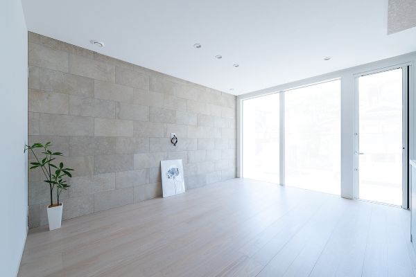 テレビ裏のタイルが空間のアクセントに。お洒落なリビングを演出します。
