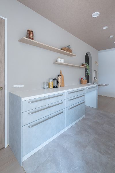 オープン棚を備えた背面収納で、見せる収納の楽しさをプラス。キッチン空間を華やかに演出します。
