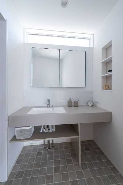 造作洗面台で可愛くスタイリッシュに。ニッチ収納で小物もスッキリ片付きます。