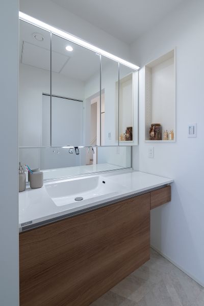 化粧水などすっきり収納できる便利なニッチを設けた洗面台。
