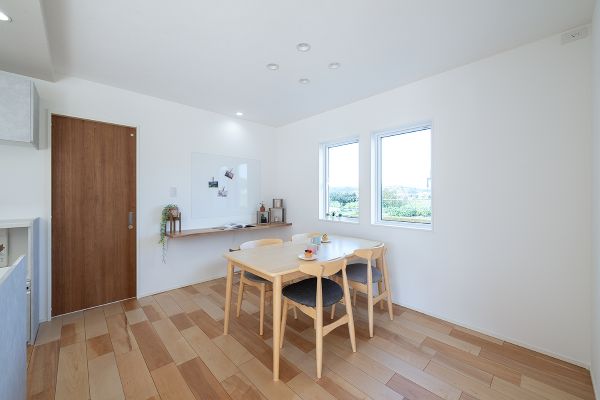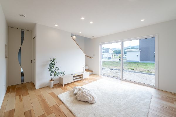 リビングは開放感があり、大きな掃き出し窓から明るい光が差し込む、温かみのある空間に。