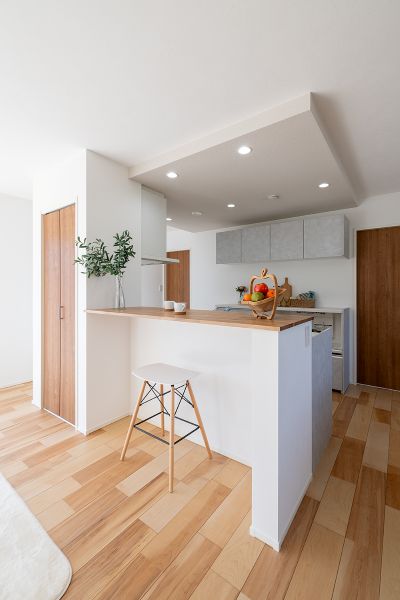 手元を隠しながらアイランドのように使えるキッチン。
