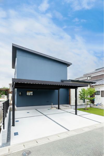 ネイビーの外観に、西側はあえて窓を設けず、お家の顔となる面をスッキリとした印象に。