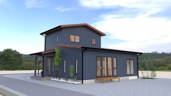 ネイビーの外壁に木目の軒が落ち着きのある外観に。