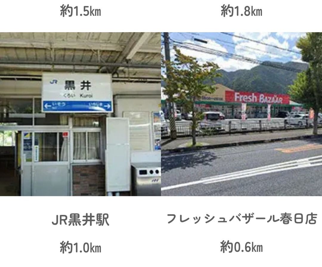 スーパーや学校、駅が徒歩圏内にそろい、春日ICへも車で約4分。