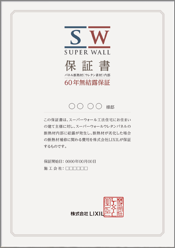 スーパーウォールパネルに使用している断熱材は、水分を透しにくい硬質ウレタンフォームを採用。室内からの湿気をガードし、断熱材内部に結露を発生させない高性能な断熱材です。LIXILは、瑕疵保証(10年間)では保証されない断熱材内部の結露による劣化を60年間保証します。