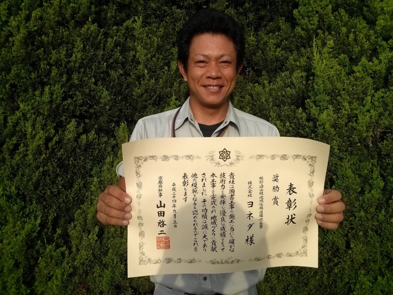 2012年9月6日新着情報このたび、京都府地域づくり優良工事施工者表彰の奨励賞を受賞しました。現場は厳冬期の風雪をついての夜間工事でありました。この受賞を機により高い質の向上を目指し、お客様に喜ばれる仕事をしていきたいと思います。工事名:網野峰山線地域振興道路他工事 前の記事へ次の記事へ 新着情報一覧へ戻る