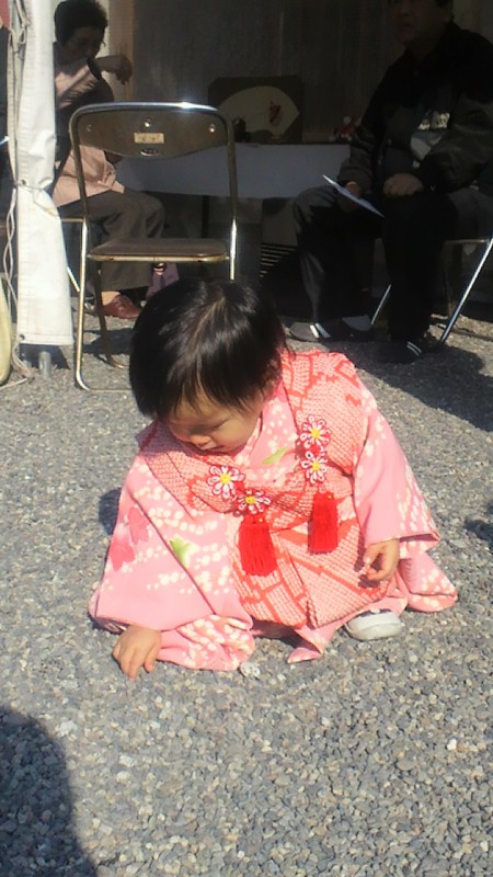 境内に敷いてある砂利遊びに夢中で、着物の袖にたくさん砂利が入ってしまいました。