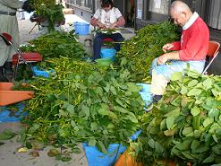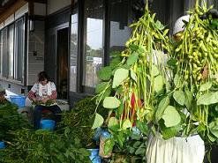 「紫ずきん」といいまして、丹波地方が誇る高級食材の一つ、新丹波黒大豆を改良したもので、平成7年に早熟系統の品種として登録された京野菜です。旬は9月中旬から10月下旬にかけてです。なので義父は5時に起きて作業します。枝木から1個ずつはさみで切り取り選別します。奥の女性は近所のおばさんで赤い服のおじさんは親戚の方です。枝で見えにくいですが一番奥にいるのが私の実父です。枝を持っているのが義父です。私も休みの日は手伝いをしますが、今週は仕事ですので残念ながら手伝いができませんでした。篠山の枝豆もおいしいですが、また違った味ですのでぜひご賞味あれ。