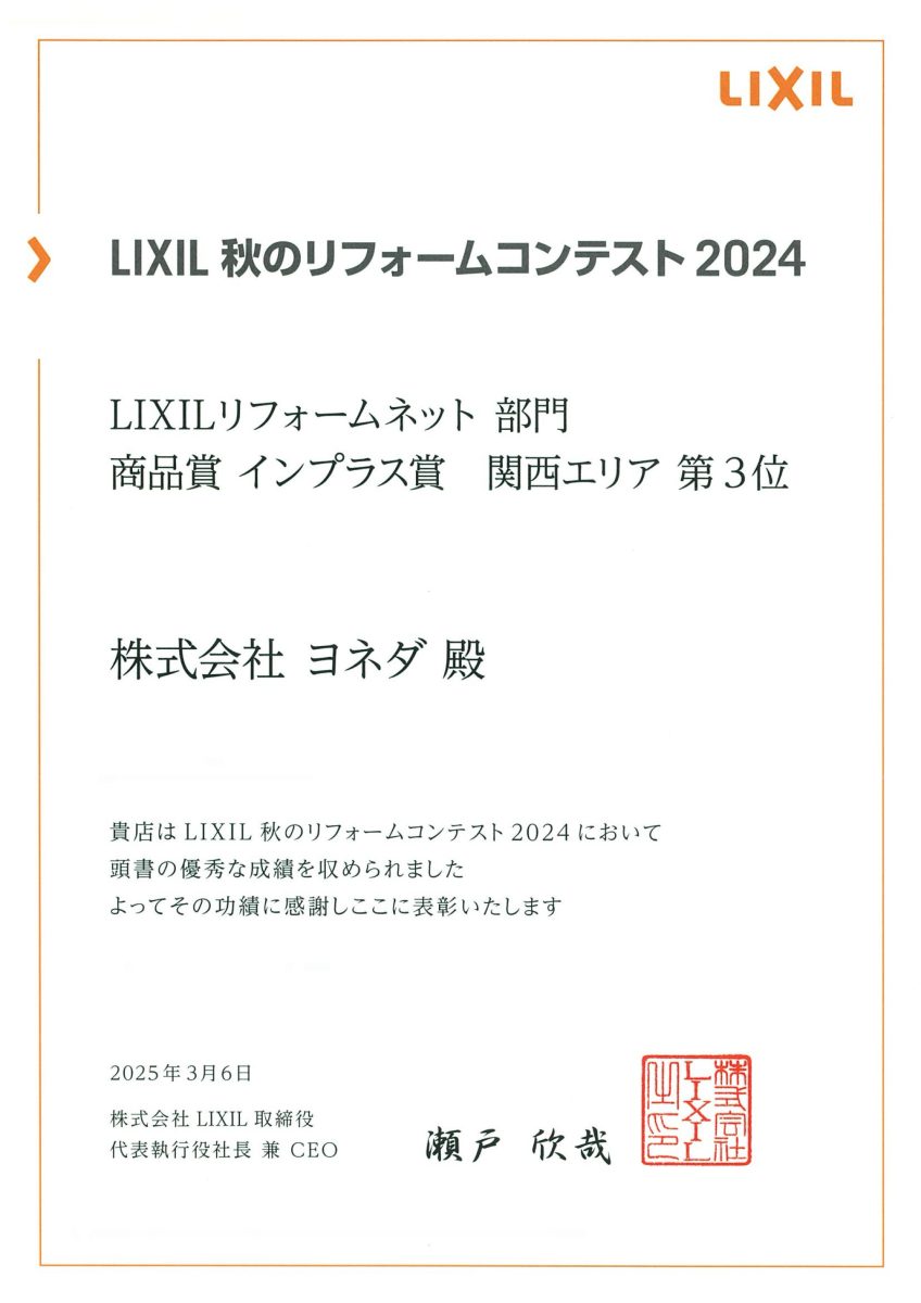LIXIL 秋のリフォームコンテスト2024 LIXILリフォームネット部門で表彰頂きました。
