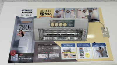 壁に取り付けられるヒーターです。ボタン一つで瞬時に暖かくなります。涼風機能もついていて夏場は扇風機代わりになります。