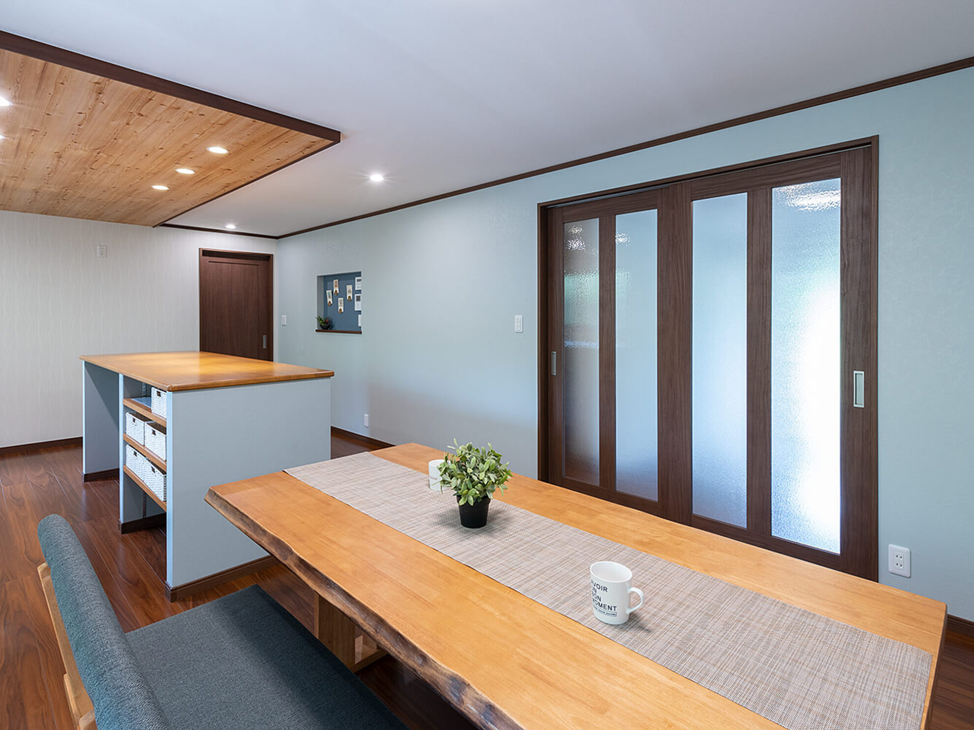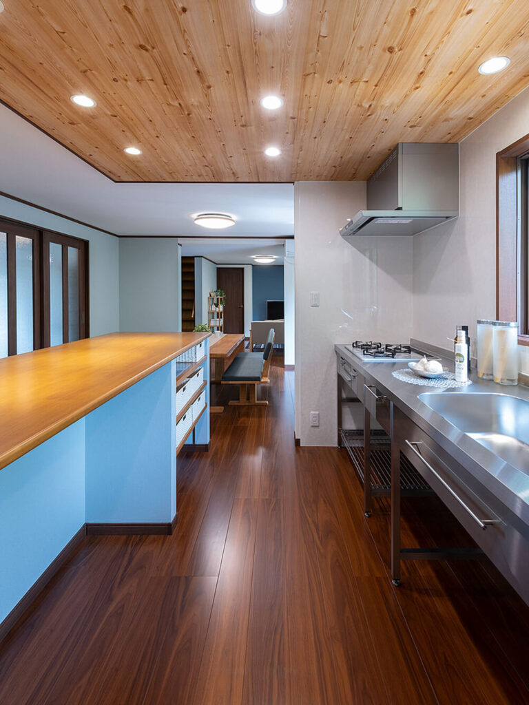 お客様こだわりのステンレスのキッチンがポイントになるように、天井を一段低くし木目のクロスを貼りました。