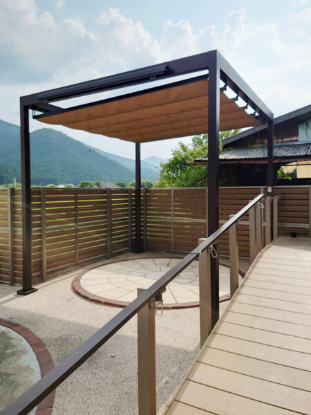 屋根のキャンバスはロープで簡単に開閉できる仕様で、天気やシーンに応じて柔軟に使い分けが可能です。