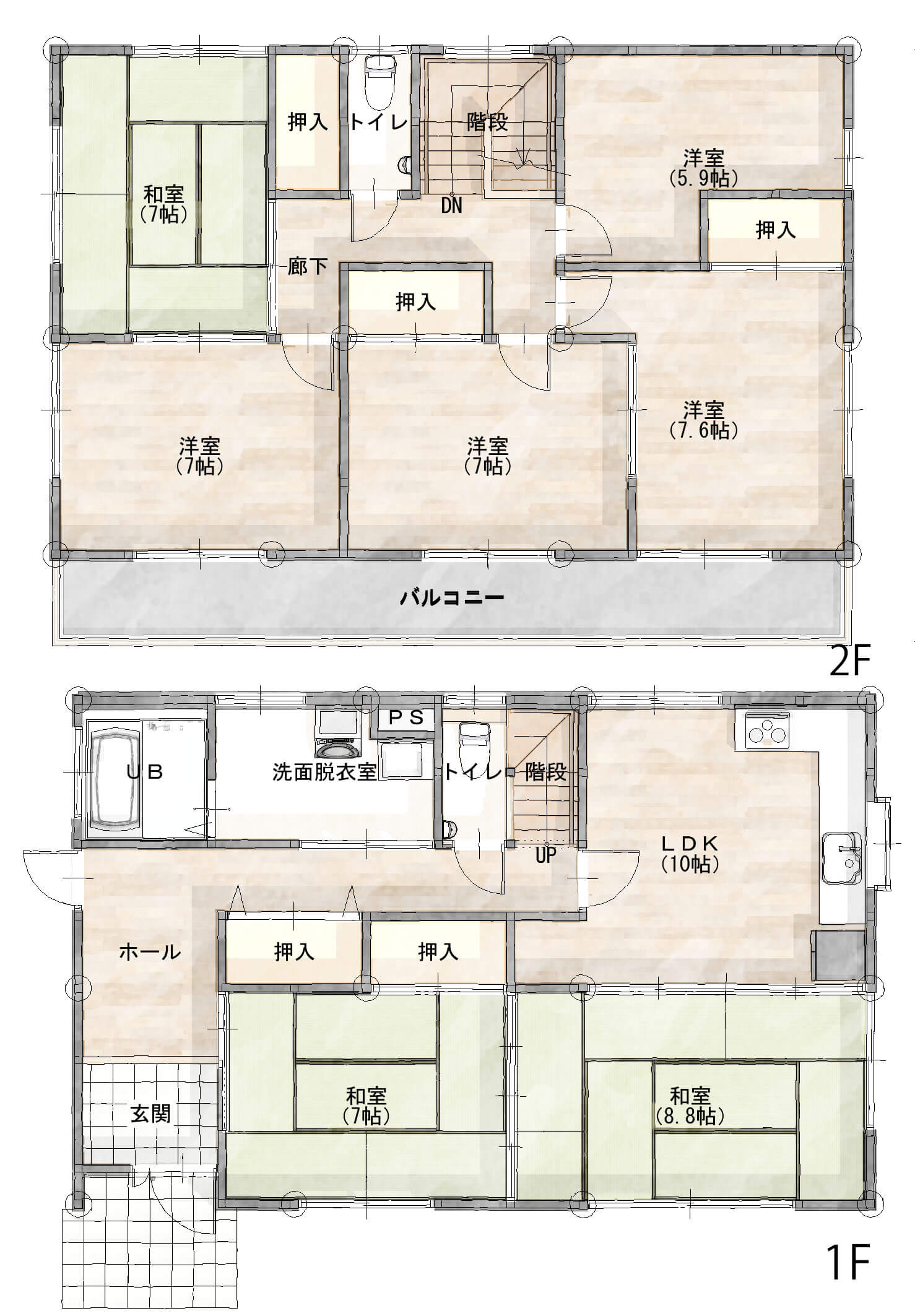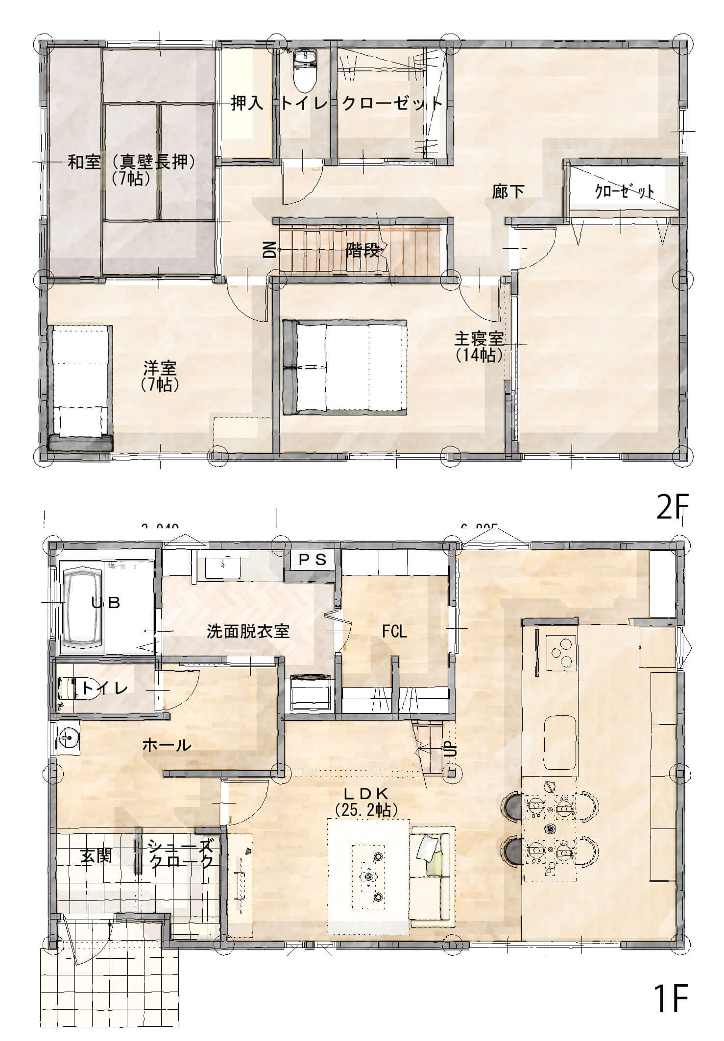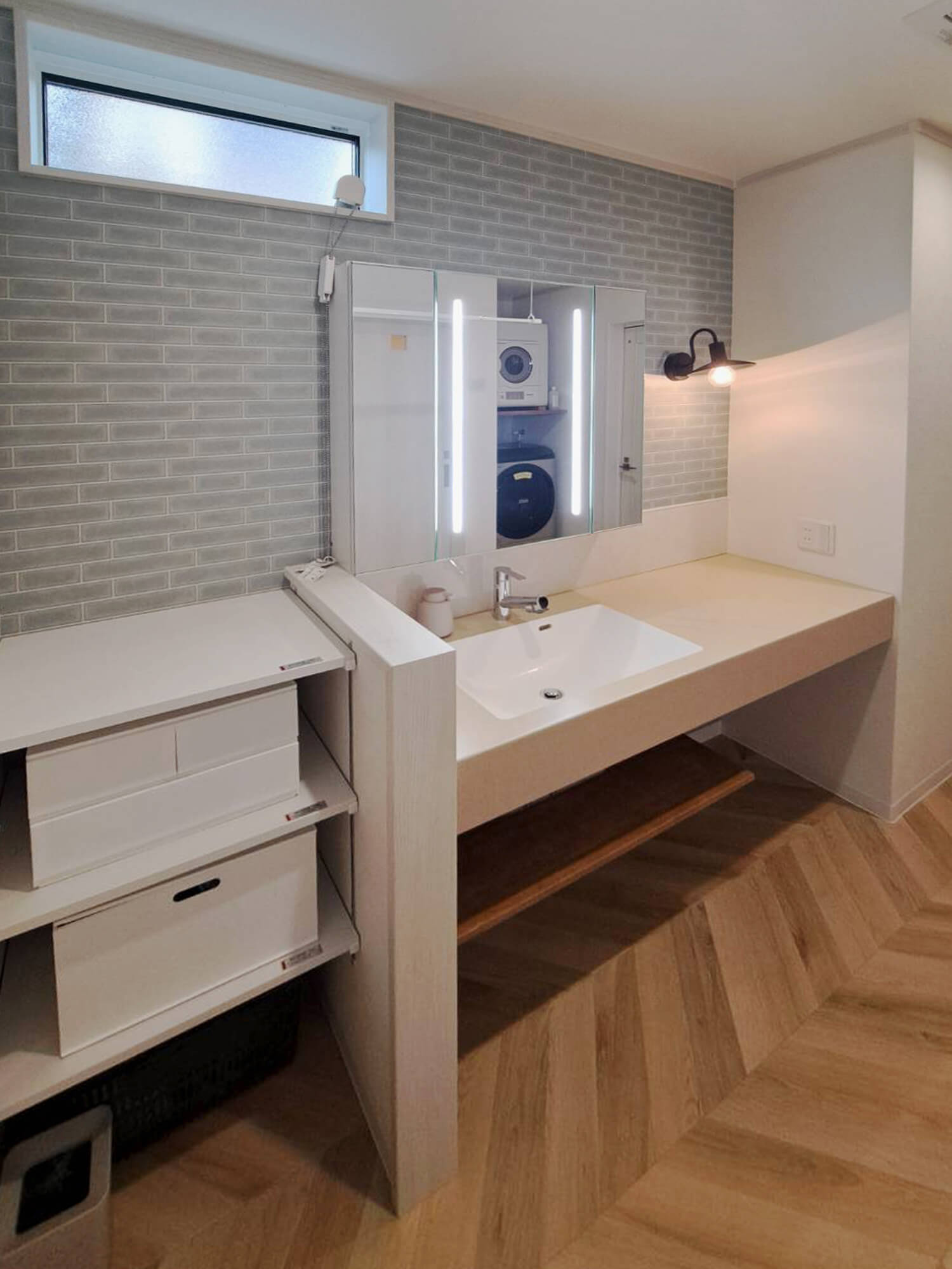 | 採用機器 | システムキッチン : クリナップ STEDIA フラット対面ペニンシュラ システムバス : TOTO サザナHTS 1616 トイレ : 1F TOTO GGA3 2F GG1-800 洗面化粧台 : AICA スマートサニタリーU ピテラスミラー: クリナップ TIARIS 玄関手洗い器 : タカラスタンダード コンパクト手洗器 玄関扉 : LIXIL 断熱玄関ドア K2 サッシ : LIXIL サーモスⅡH シューズクローク : WOODONE |