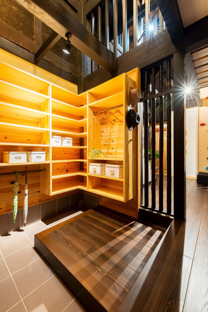 大容量の玄関収納は大家族のお履き物や上着を十分収納できるようにしました。