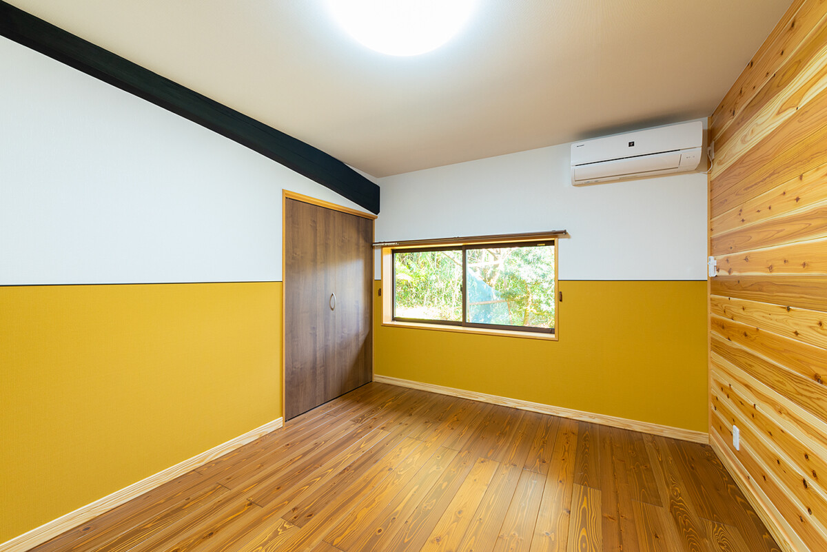 壁面、2階天井は杉板張り、アクセントクロスで、お子様の個性に合わせ各部屋イメージを変えました。