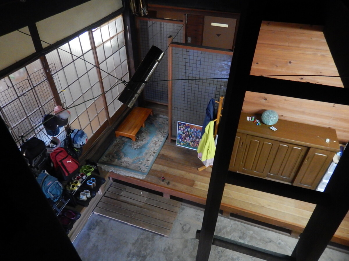 梁むき出しの天井、土壁、梁と残せる古材は最大限に生かし吹き抜けに。