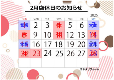 2月の店休日は以下のとおりです。