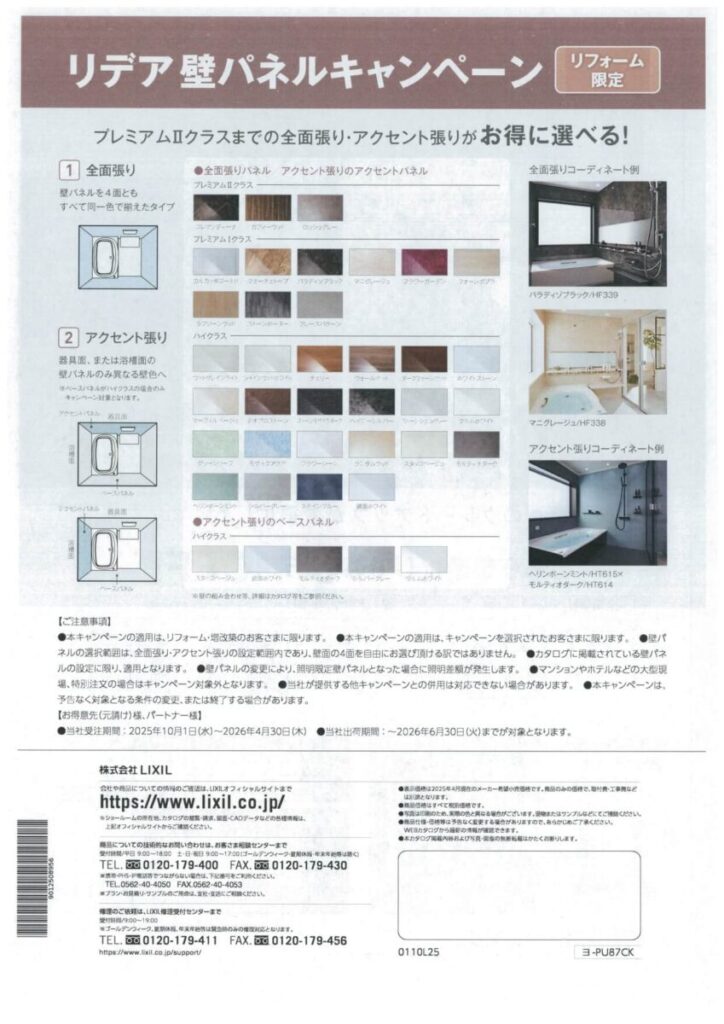リフォーム限定のLIXIL システムバス〈リデア〉壁パネルキャンペーンがスタート。