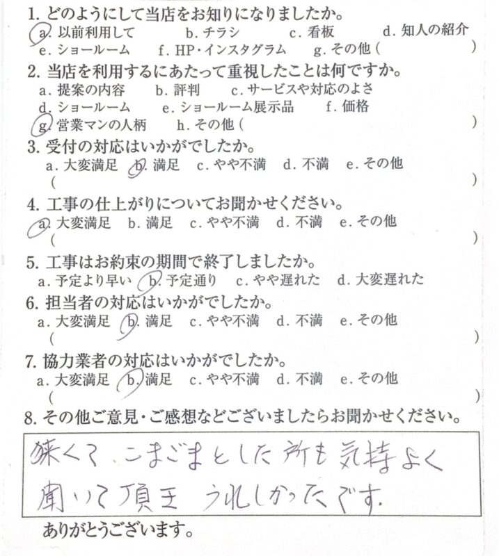綾部市 H様邸|和室改修工事 施工時期:2025年11月 1. どのようにして当店をお知りになりましたか。以前利用して2. 当店を利用するにあたって重視したことは何ですか。営業マンの人柄3. 受付の対応はいかがでしたか。満足4. 工事の仕上がりについてお聞かせください。大変満足5. 工事はお約束の期間で終了しましたか。予定通り6. 担当者の対応はいかがでしたか。満足7. 協力業者の対応はいかがでしたか。満足8. ご意見・ご感想狭くてこまごまとした所も気持よく聞いて頂きうれしかったです