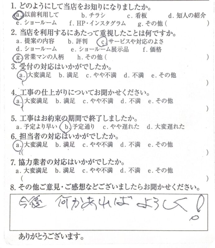 福知山市 A様邸|キッチン排水改修工事 施工時期:2025年11月 1. どのようにして当店をお知りになりましたか。以前利用して2. 当店を利用するにあたって重視したことは何ですか。サービスや対応のよさ, 営業マンの人柄3. 受付の対応はいかがでしたか。大変満足4. 工事の仕上がりについてお聞かせください。大変満足5. 工事はお約束の期間で終了しましたか。予定通り6. 担当者の対応はいかがでしたか。大変満足7. 協力業者の対応はいかがでしたか。大変満足8. ご意見・ご感想今後何かあればよろしく!