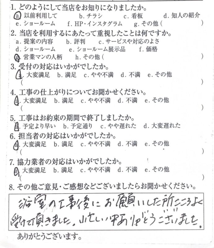浴室の工事後にお願いした所こころよく受けて頂きました。