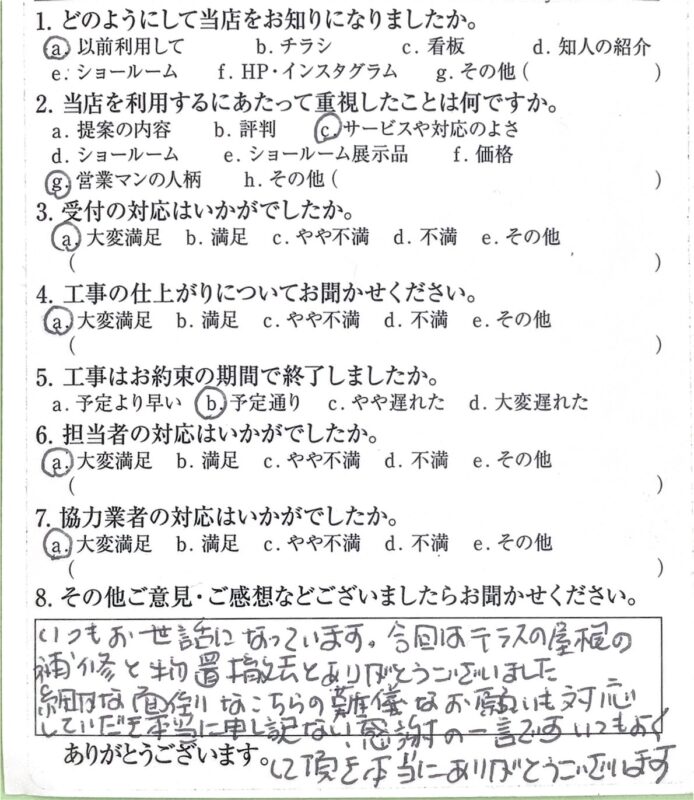 今回はテラスの屋根の補修と物置撤去とありがとうございました。
