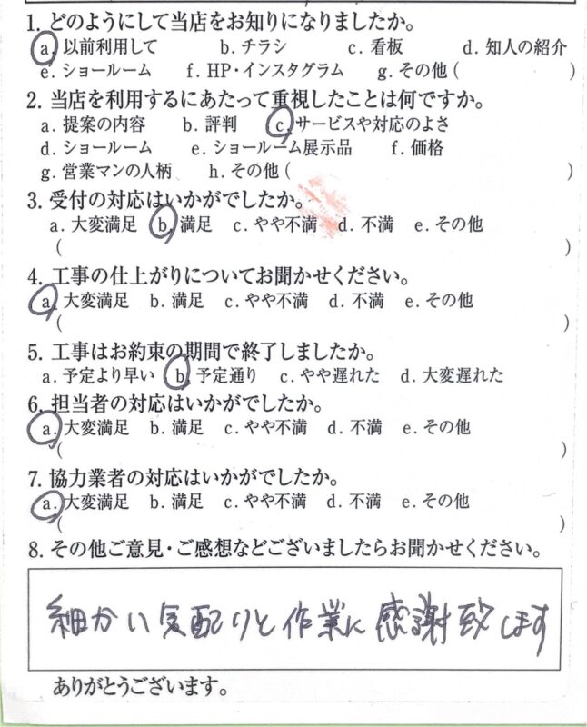 福知山市 A様邸|テラス取付工事 施工時期:2026年1月 1. どのようにして当店をお知りになりましたか。以前利用して2. 当店を利用するにあたって重視したことは何ですか。サービスや対応のよさ3. 受付の対応はいかがでしたか。満足4. 工事の仕上がりについてお聞かせください。大変満足5. 工事はお約束の期間で終了しましたか。予定通り6. 担当者の対応はいかがでしたか。大変満足7. 協力業者の対応はいかがでしたか。大変満足8. ご意見・ご感想細かい気配りと作業に感謝致します。