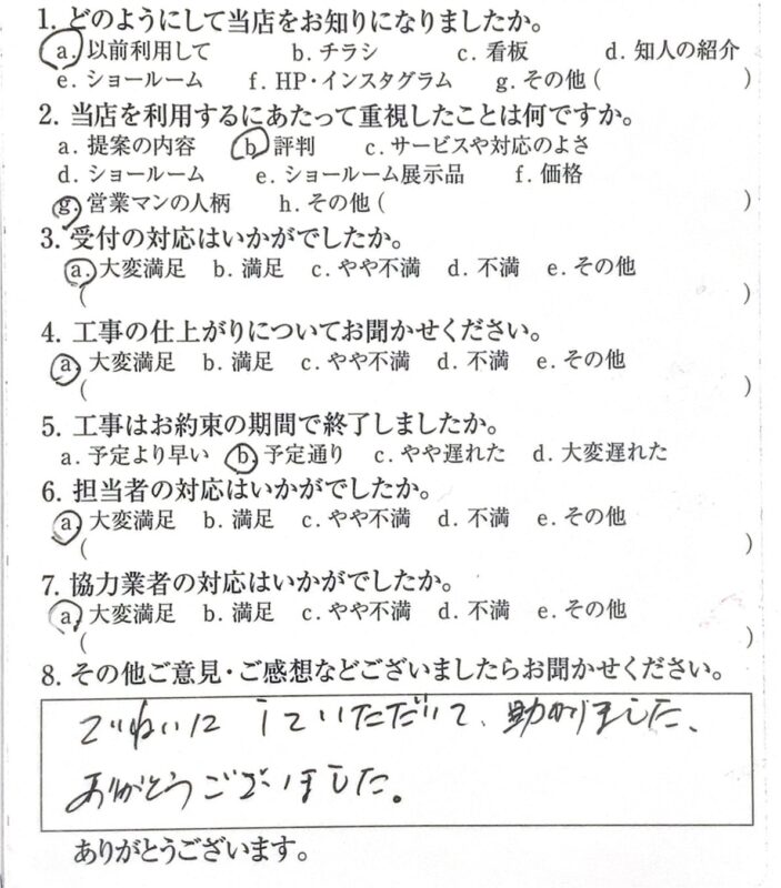 福知山市 N様邸|外壁修繕工事 施工時期:2026年1月 1. どのようにして当店をお知りになりましたか。以前利用して2. 当店を利用するにあたって重視したことは何ですか。営業マンの人柄3. 受付の対応はいかがでしたか。大変満足4. 工事の仕上がりについてお聞かせください。大変満足5. 工事はお約束の期間で終了しましたか。予定通り6. 担当者の対応はいかがでしたか。大変満足7. 協力業者の対応はいかがでしたか。大変満足8. ご意見・ご感想ていねいにしていただいて助かりました。 ありがとうございました。