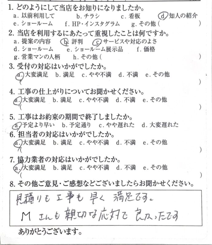 福知山市 H様邸|浴室暖房取付工事 施工時期:2026年2月 1. どのようにして当店をお知りになりましたか。知人の紹介2. 当店を利用するにあたって重視したことは何ですか。評判, サービスや対応のよさ3. 受付の対応はいかがでしたか。大変満足4. 工事の仕上がりについてお聞かせください。大変満足5. 工事はお約束の期間で終了しましたか。予定より早い6. 担当者の対応はいかがでしたか。大変満足7. 協力業者の対応はいかがでしたか。大変満足8. ご意見・ご感想見積も工事も早く満足です。 Mさんも親切な応対で良かったです。