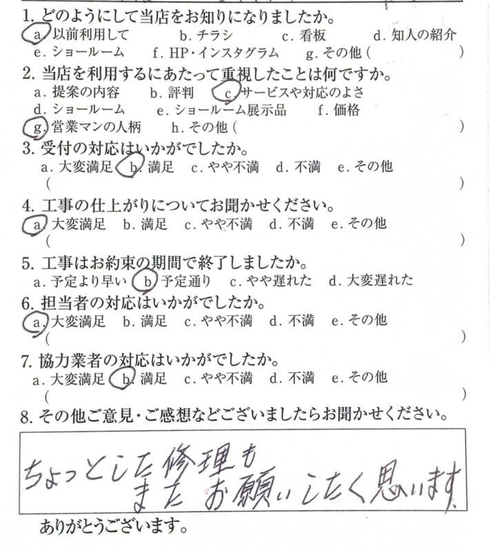 綾部市 N様邸|勝手口ドアノブ取替工事 施工時期:2026年2月 1. どのようにして当店をお知りになりましたか。以前利用して2. 当店を利用するにあたって重視したことは何ですか。サービスや対応のよさ, 営業マンの人柄3. 受付の対応はいかがでしたか。満足4. 工事の仕上がりについてお聞かせください。大変満足5. 工事はお約束の期間で終了しましたか。予定通り6. 担当者の対応はいかがでしたか。大変満足7. 協力業者の対応はいかがでしたか。満足8. ご意見・ご感想ちょっとした修理もまたお願いしたく思います。