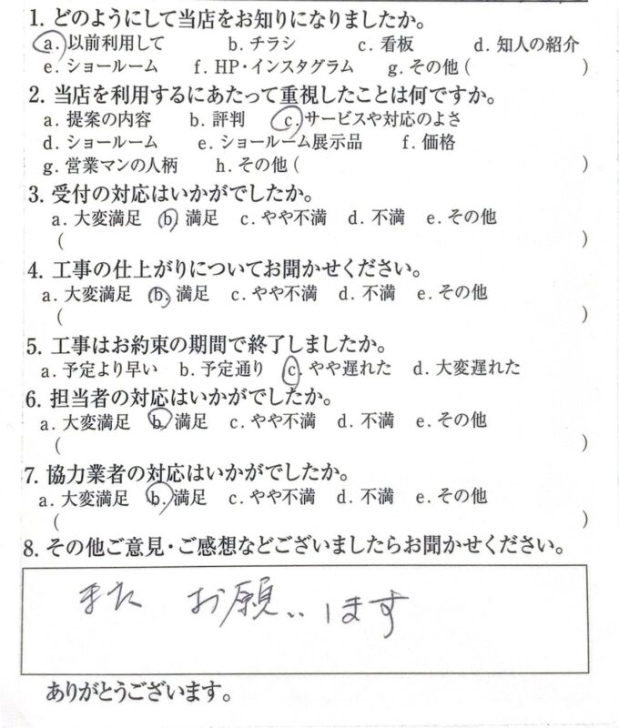 福知山市 H様邸|床上貼り工事 施工時期:2026年2月 1. どのようにして当店をお知りになりましたか。以前利用して2. 当店を利用するにあたって重視したことは何ですか。サービスや対応のよさ3. 受付の対応はいかがでしたか。満足4. 工事の仕上がりについてお聞かせください。満足5. 工事はお約束の期間で終了しましたか。やや遅れた6. 担当者の対応はいかがでしたか。満足7. 協力業者の対応はいかがでしたか。満足8. ご意見・ご感想また、お願いします。
