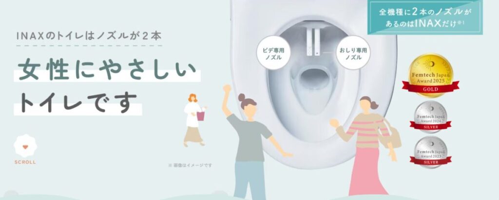 おしり洗浄用のノズルとビデ洗浄用のノズルの2本が別々に配置されており、衛生面も安心です。