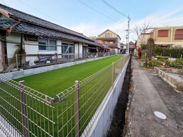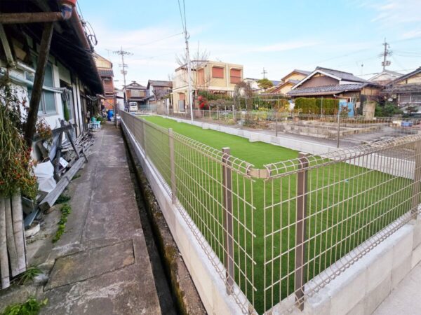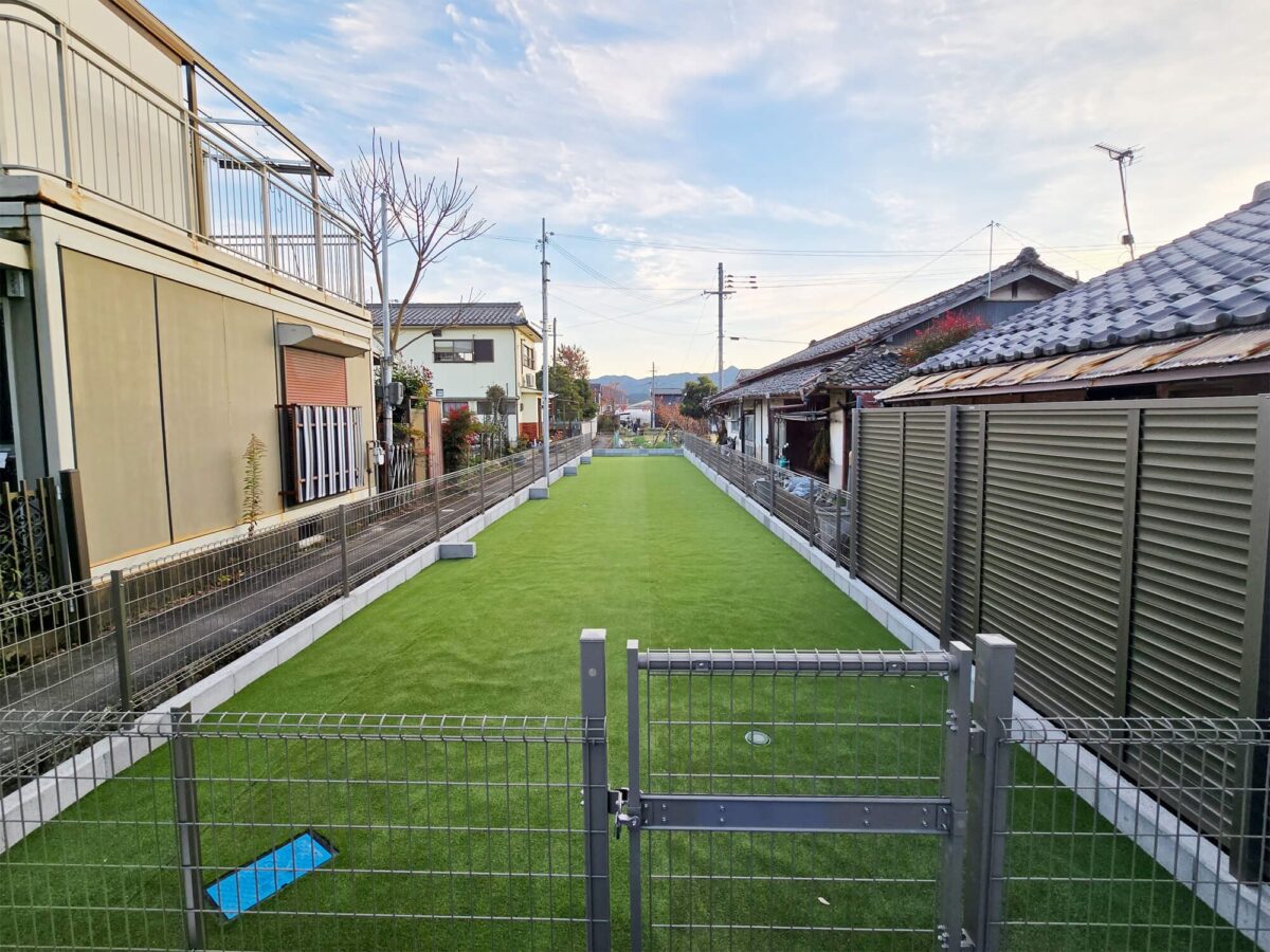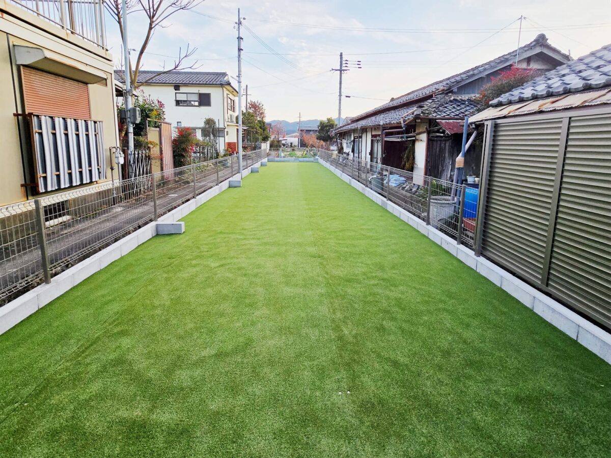 もともと畑として使われていたスペースを、草取りの手間を減らし、安心して使えるお庭にしたいとのご相談をいただき、防草シートを施工した上で人工芝を敷設しました。