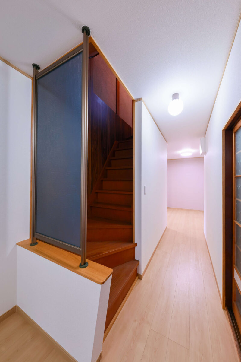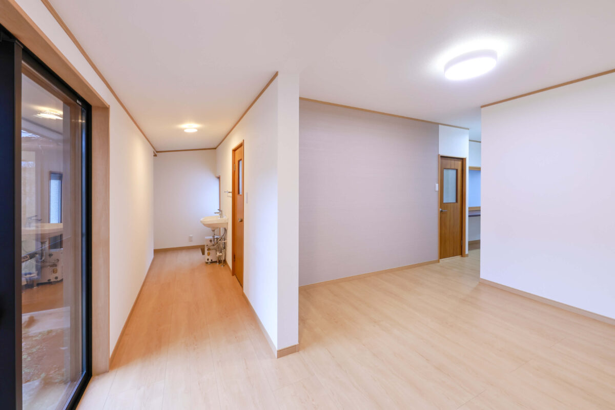以前は部屋を通らないと各部屋に行けませんでしたが、あえて廊下を設けて、プライバシーの確保を行いました。