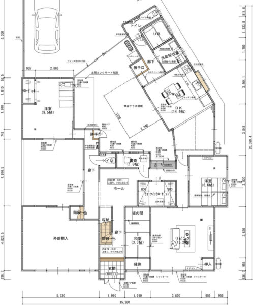 | 採用機器 | システムキッチン:タカラスタンダード トレーシア 洗面化粧台:タカラスタンダード オンディーヌ トイレ:TOTO GG1 フローリング ラシッサS 玄関ドア:LIXIL グランデル2 156型 フェンス:LIXIL フェンスAB YL2型 門扉:LIXIL 門扉AB YM1型 |
