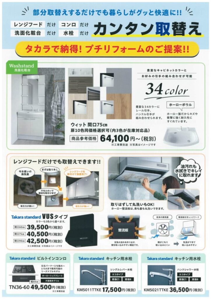 レンジフードだけ、コンロだけ、水栓だけ、洗面化粧台だけ。