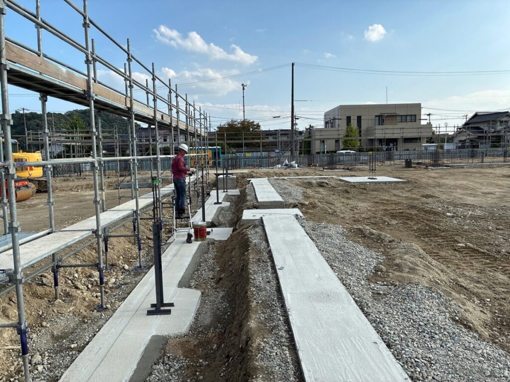 先週は2工区基礎掘削、均しコンクリート打設を行い、基礎配筋にも着手しました。 今週は、引き続き1工区基礎配筋、2工区アンカー据付を行います。 また、来週からは型枠建込を行います。 気温もだんだんと下がってきましたが、頑張っていきます。
