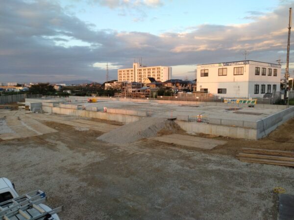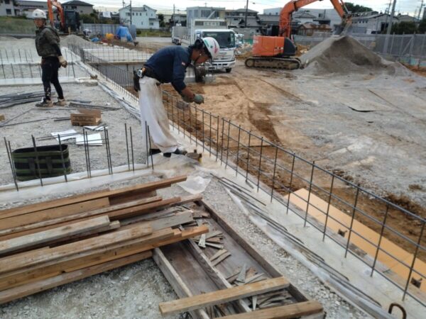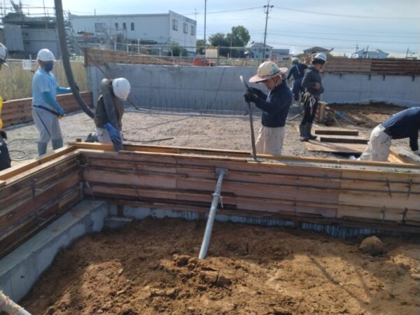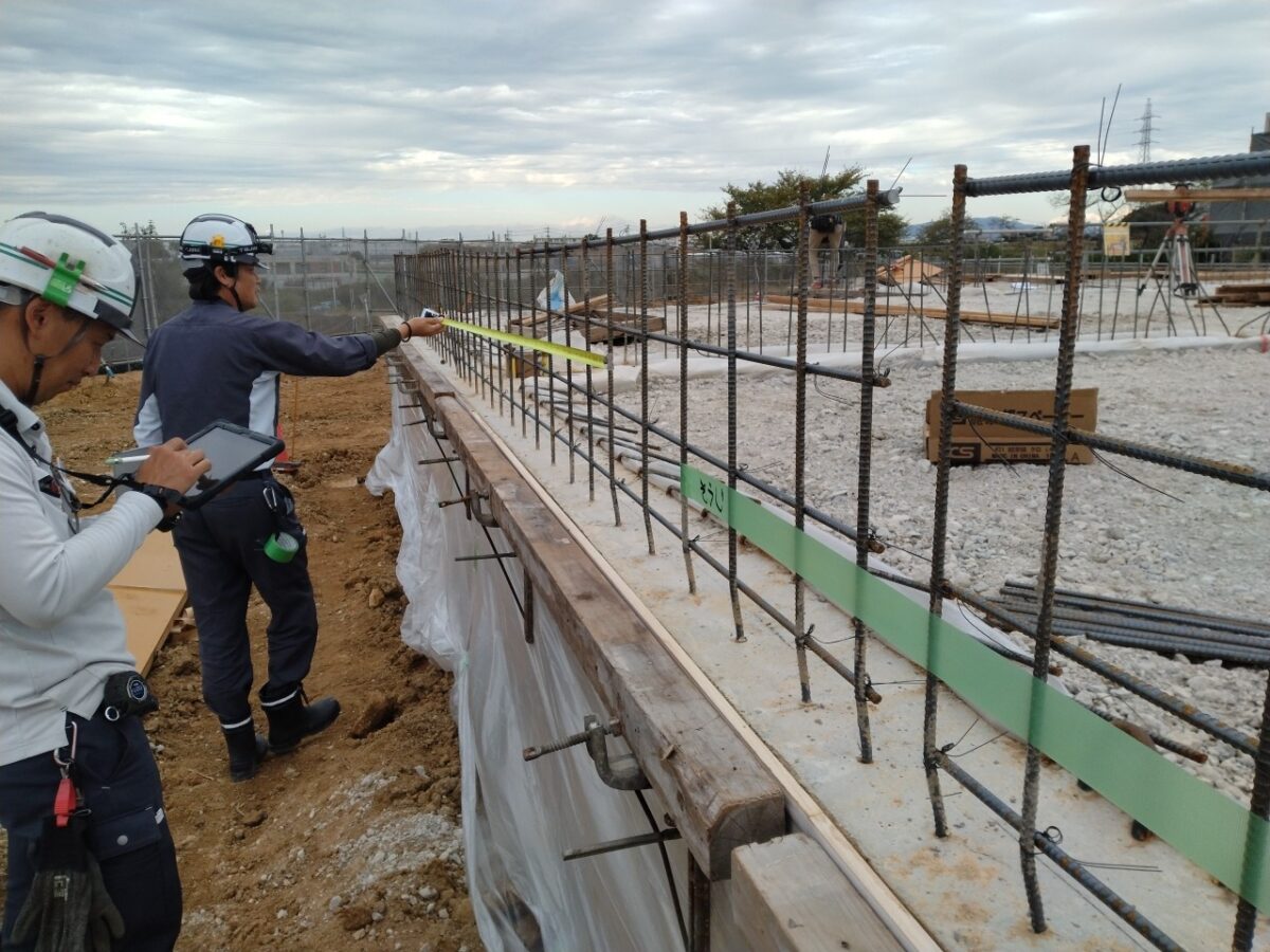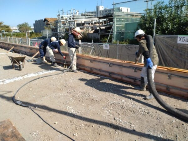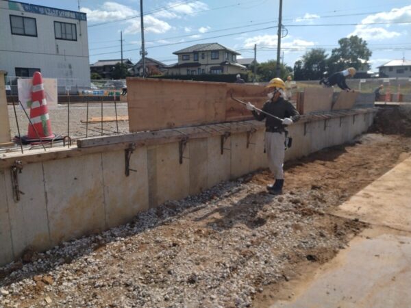 先週、腰壁配筋、型枠建て込みを行い、週末に腰壁コンクリートを打設しました。 29日より鉄骨建て方に着手します。