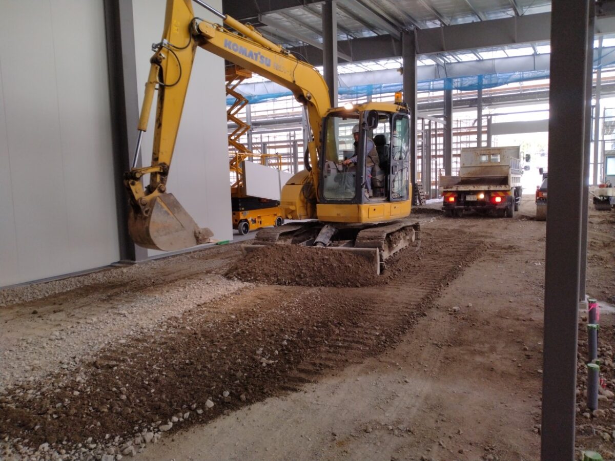今週は、事務所不陸整正、防湿シート貼り、耐火パネル・冷凍パネル建込みを行いました。来週は、引き続きパネル建込み、事務所・常温倉庫土間配筋、外壁張り、ケラバ、軒樋・竪樋取付を行います。